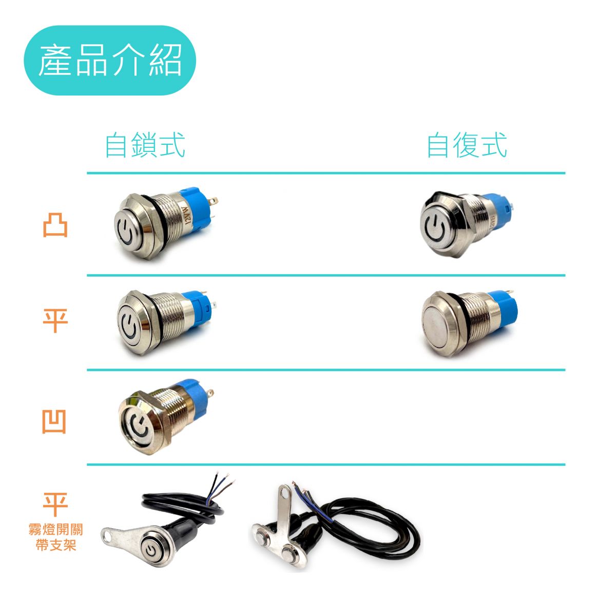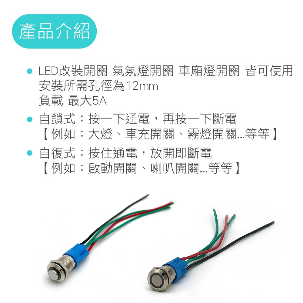 自鎖式:按一下通電,再按一下斷電 【用於:大燈、車充開關、霧燈開關...等等】